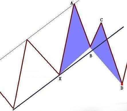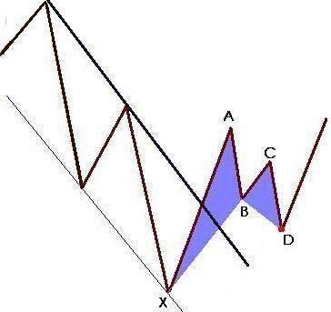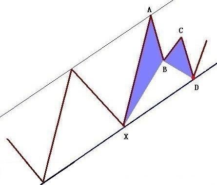 2、價格在通道內形成蝴蝶形態(tài),形態(tài)的大部份在通道內,但是D點已經脫離通道并且低于X點,價格有改變原先趨勢的傾向,這時只可以在D點處少量建倉,但不容易設置止損點。