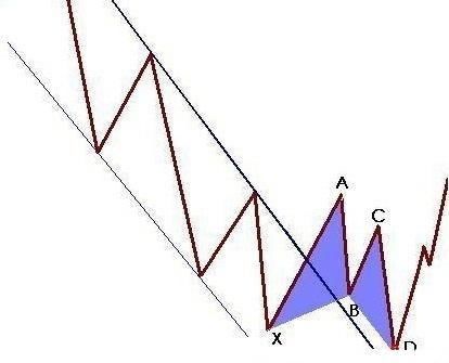 1、價格在通道內形成Gartley形態(tài),傾向于按原通道方向進行操作,如果Gartley形態(tài)形成時,D點剛好在通道趨勢線上,則D點是極佳的建倉點。