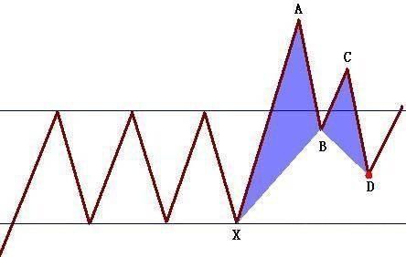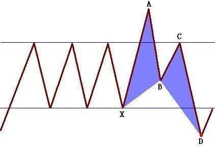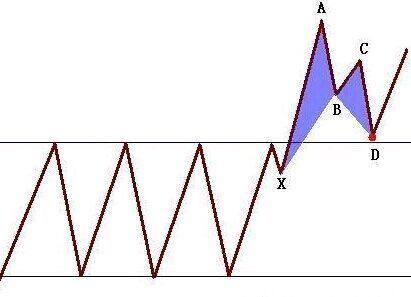 2、價格在突破區(qū)間后形成蝴蝶形態(tài),之前A點的突破極有可能是個假突破,D點才是真正運行方向,如果形態(tài)形成前已經介入,則易擇機平倉,并且如果可以做空則侍機在反方向建倉。