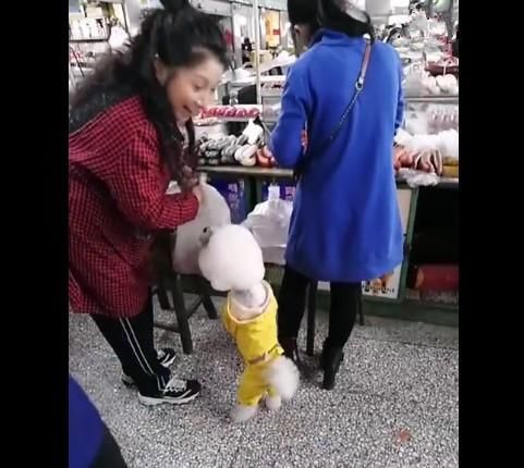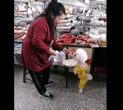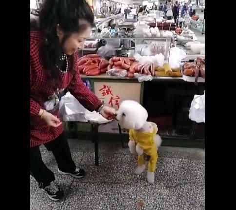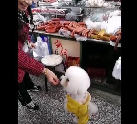 主人帶著比熊到菜市場買東西。一來到菜市場,聞到肉香味的比熊不再聽主人叫離開的指令,跑到賣肉腸的大姐面前賣萌討肉吃。