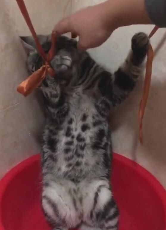 綁住了雙手就可以或許淋水了,如許就不擔(dān)憂他會(huì)亂抓,被綁的小貓咪一臉的懵逼,完整不知道客人籌備對他做甚么工作,時(shí)不時(shí)還發(fā)出了啼聲。