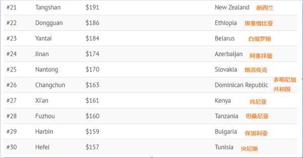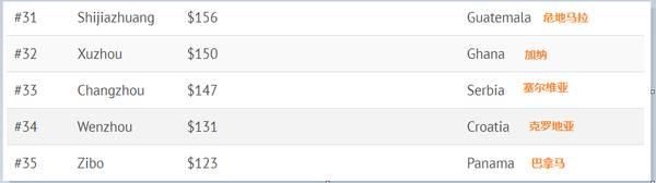 根據(jù)圖表顯示,在2015年,長(zhǎng)三角的GDP總量達(dá)到2.62萬(wàn)億美元,超過(guò)GDP總量為2.31萬(wàn)億美元的意大利;珠三角則以1.89萬(wàn)億美元的GDP總量超過(guò)1.83萬(wàn)億美元的韓國(guó);北京和天津的GDP總量則超過(guò)澳大利亞,兩者的GDP總量分別為1.14萬(wàn)億美元和1.13萬(wàn)億美元。根據(jù)調(diào)查報(bào)告展示的35座中國(guó)城市在全球范圍內(nèi)GDP水平與之比肩的國(guó)家或地區(qū)分別為: