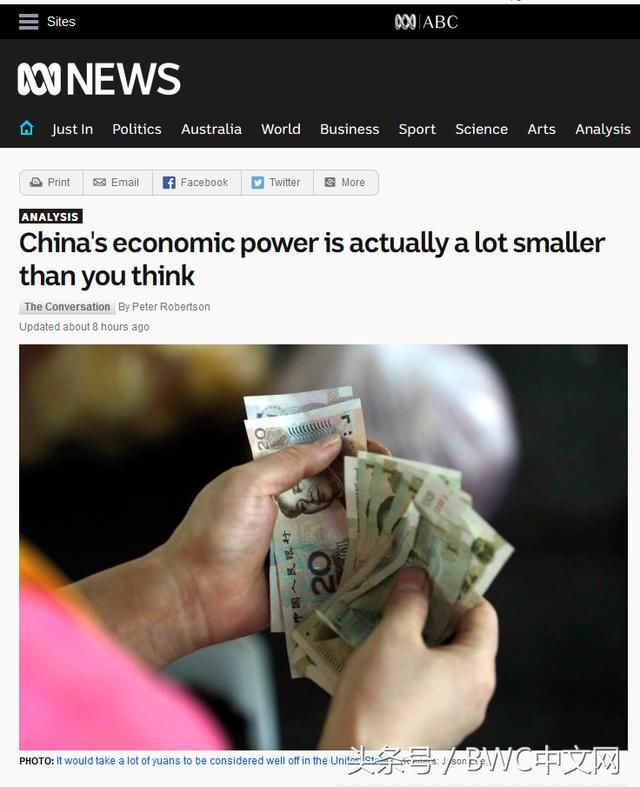 的確,中國(guó)經(jīng)濟(jì)的增長(zhǎng)讓西方國(guó)家看到了商機(jī),但同時(shí)也引發(fā)了“中國(guó)經(jīng)濟(jì)威脅論”的憂慮。不過(guò),最近就有澳大利亞專(zhuān)家找到了安慰西方國(guó)家的新理由。上個(gè)月29日,澳大利亞教授皮特·羅伯遜在多家外國(guó)媒體上發(fā)表了評(píng)論文章稱(chēng),“中國(guó)經(jīng)濟(jì)實(shí)力比想象中小得多”。他首先肯定了中國(guó)經(jīng)濟(jì)在世界的地位: