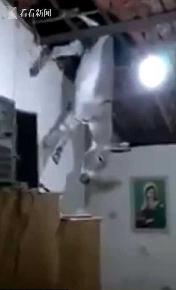 根據(jù)這戶家人拍攝的視頻,這頭毛驢當時掉到廚房間的屋頂上,踩穿了屋頂,頭朝下靠兩條后腿懸掛在房梁上。這家人被突如其來天上掉下一大活物嚇了一跳,緩過神后撥打了求救電話。